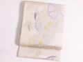 清楚で涼やかな印象のオフホワイトの帯地に、唐織で菊と束ね熨斗が印象的にデザインされています。また、帯地部分や模様部分には金・銀糸が惜しみなく使用され、とても華やかな雰囲気を演出しています。熨斗の中には可愛らしい鹿の子模様や唐草などが織り込まれています。また、背景には観世水模様が織り込まれ、とても格調高い雰囲気を増しています。