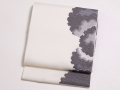 涼感のあるオフホワイトの帯地に、可愛らしい疋田模様で構成された雪輪模様が重なり合うように配されています。雪輪模様の中には白色やグレーの糸で、雲の形が織なされています。