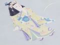 美しい着物を纏った可愛らしい童子が、軽く涼感ある淡いブルーの地色の中にたたずむ様子が描かれています。模様は友禅染の手法で総手描きで描かれており、童子の髪の毛や着物のシワに至るまで非常に繊細なタッチで精緻に表現されていて、職人の手使いや緊張感が伝わってくるようです。